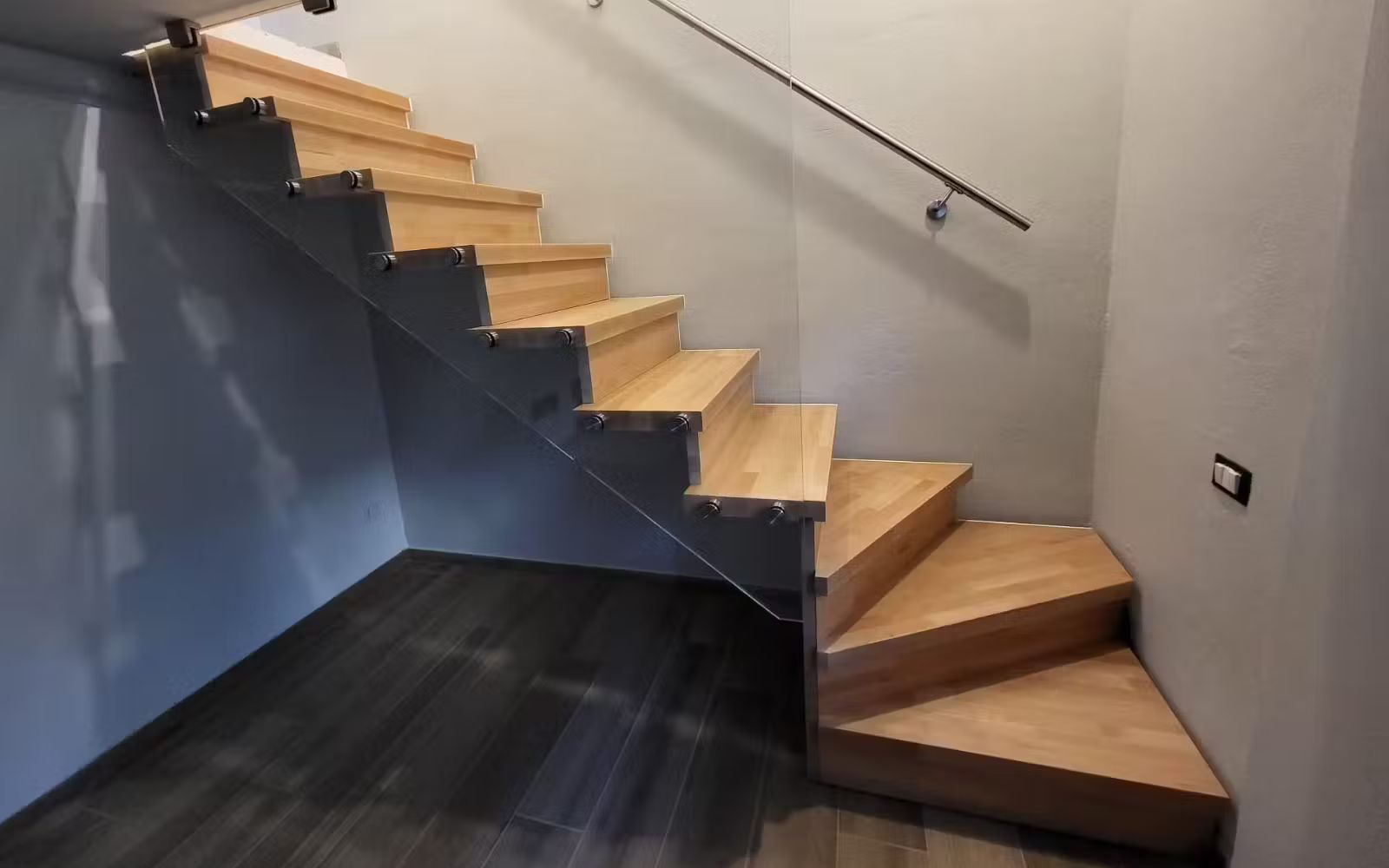 Scala in legno con protezioni in vetroe corrimano in acciaio.